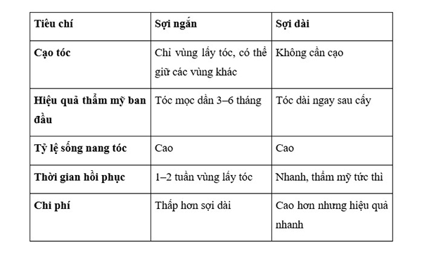 Cấy tóc có phải cạo đầu không? Câu trả lời là phụ thuộc vào bạn chọn cấy tóc sợi ngắn hay sợi dài. Cả 2 đều là phương pháp phục hồi tóc phổ biến với những ưu điểm riêng. Việc chọn phương pháp nào còn phụ thuộc tình trạng tóc, nhu cầu thẩm mỹ. Để hiểu rõ sự khác biệt, hãy cùng so sánh 2 phương pháp này dưới đây.