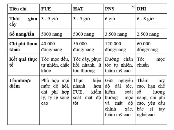 Để giúp bạn đọc hiểu rõ hơn sự khác biệt giữa các công nghệ, dưới đây là bảng so sánh cụ thể các hạng mục. Việc so sánh sẽ giúp bạn dễ dàng chọn phương án phù hợp với tình trạng hói, nhu cầu thẩm mỹ cũng như ngân sách.