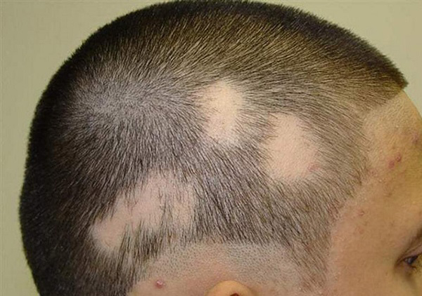 – Tóc rụng đột ngột tại một vị trí nhất định, hình thành những vùng trống trên da đầu. Những khoảng trống này có hình dáng tròn giống đồng xu, có thể lan rộng theo thời gian.