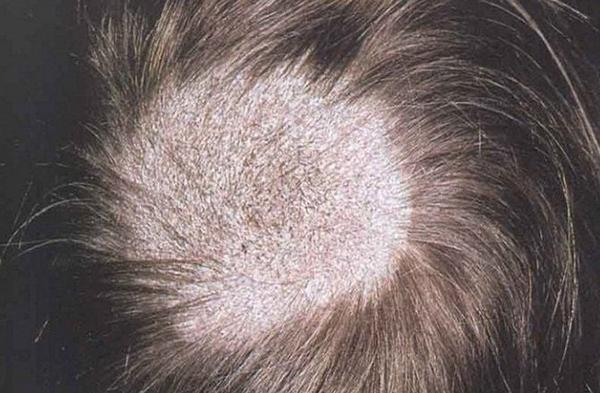 – Rụng tóc mảng do nấm nhưng da đầu chưa sẹo hóa.