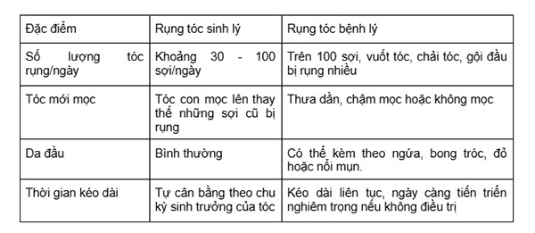 Rụng tóc sinh lý là sự thay đổi tự nhiên của tóc theo chu kỳ sống, với khoảng 30-100 sợi rụng mỗi ngày và tóc mới mọc lên thay thế. Trong khi rụng tóc bệnh lý là tình trạng rụng tóc bất thường với số lượng lớn hơn 100 sợi/ngày. Tóc không mọc lại, rụng thành từng mảng, kèm theo các dấu hiệu như ngứa, sưng đỏ da đầu.