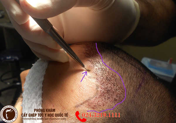 – Bước 4: Bác sĩ tiến hành sát trùng và gây tê vùng da đầu trước trán cần cấy tóc. Tạo lỗ siêu nhỏ trên da đầu và đưa các nang tóc đã được chuẩn bị vào vị trí đã định. Trong quá trình cấy, bác sĩ sẽ điều chỉnh mật độ, hướng mọc sao cho tự nhiên và đảm bảo tính thẩm mỹ nhất.