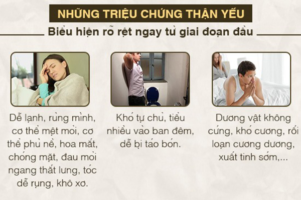 Thận hoạt động kém hiệu quả gây tiểu tiện nhiều lần, nhất là vào ban đêm. Nam giới thận yếu dẫn đến chức năng lọc của cầu thận kém đi, sự tái hấp thu nước ở ống thận suy giảm nên lượng nước tiểu đào thải ra nhiều hơn. Ngoài ra, người bệnh còn cảm thấy chóng mặt, ù tai. Có người còn bị táo bón kéo dài dù đã thực hiện chế độ ăn uống khoa học.